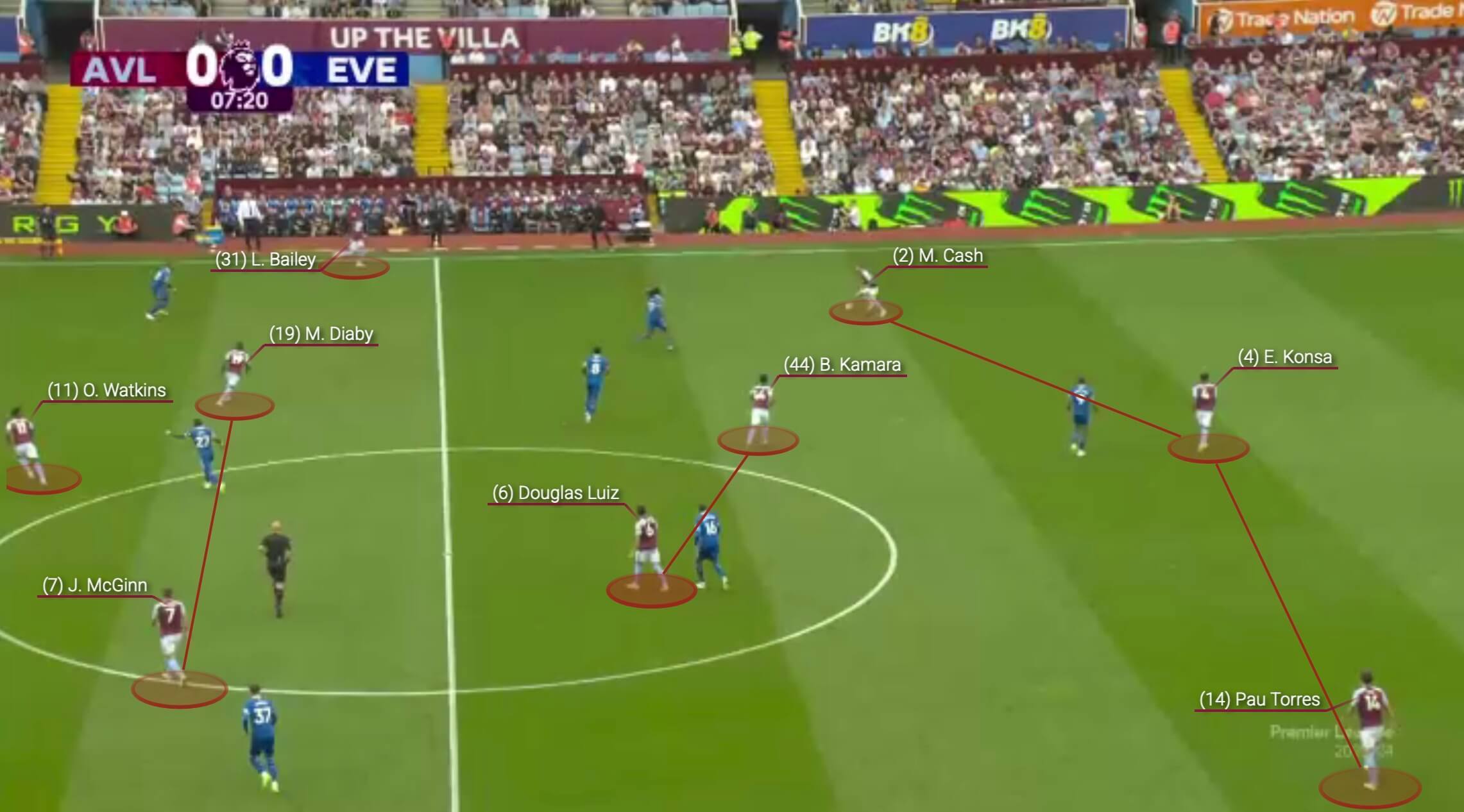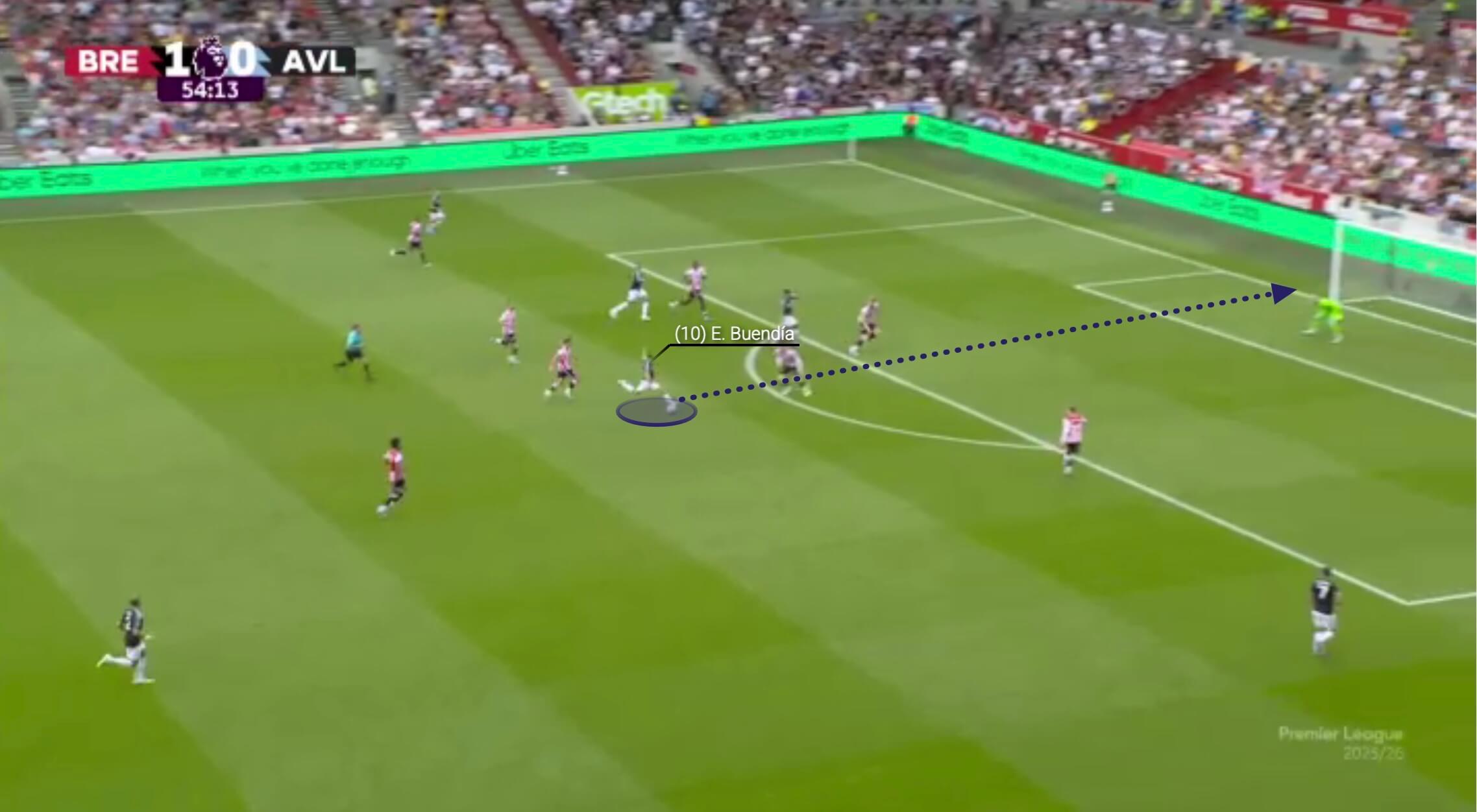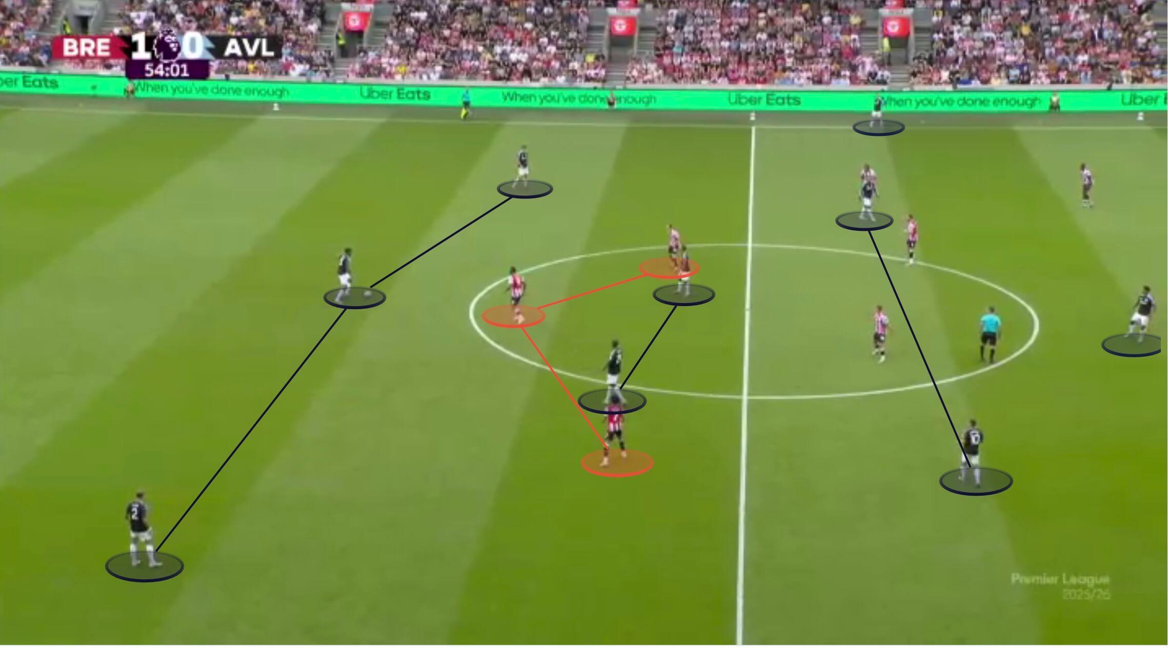 然而,最近这种对控制的追求变得过于谨慎,扼杀了进攻冒险精神。维拉在进攻组织阶段基本上仍然采用3-2-5阵型。这是8月对阵布伦特福德的比赛。