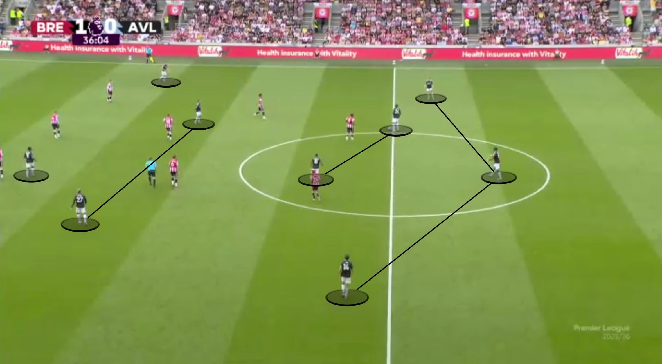 然而,最近这种对控制的追求变得过于谨慎,扼杀了进攻冒险精神。维拉在进攻组织阶段基本上仍然采用3-2-5阵型。这是8月对阵布伦特福德的比赛。